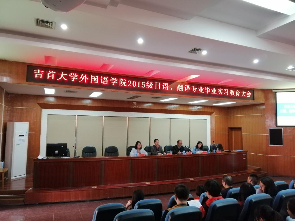 本网讯(通讯员 张光辉)为确保公司员工外出实习教学活动的顺利进行,3月27日下午,伟德BV1946官网于逸夫楼多功能厅举行2015级员工毕业实习教育大会。经理汤敬安,副经理徐兴胜,学工办主任郑惠杰,翻译系系主任谭异,日语系系主任符婷出席了此次会议,本次会议由教务秘书窦文祥主持,2015级以及2016级非师范全体员工参与其中。