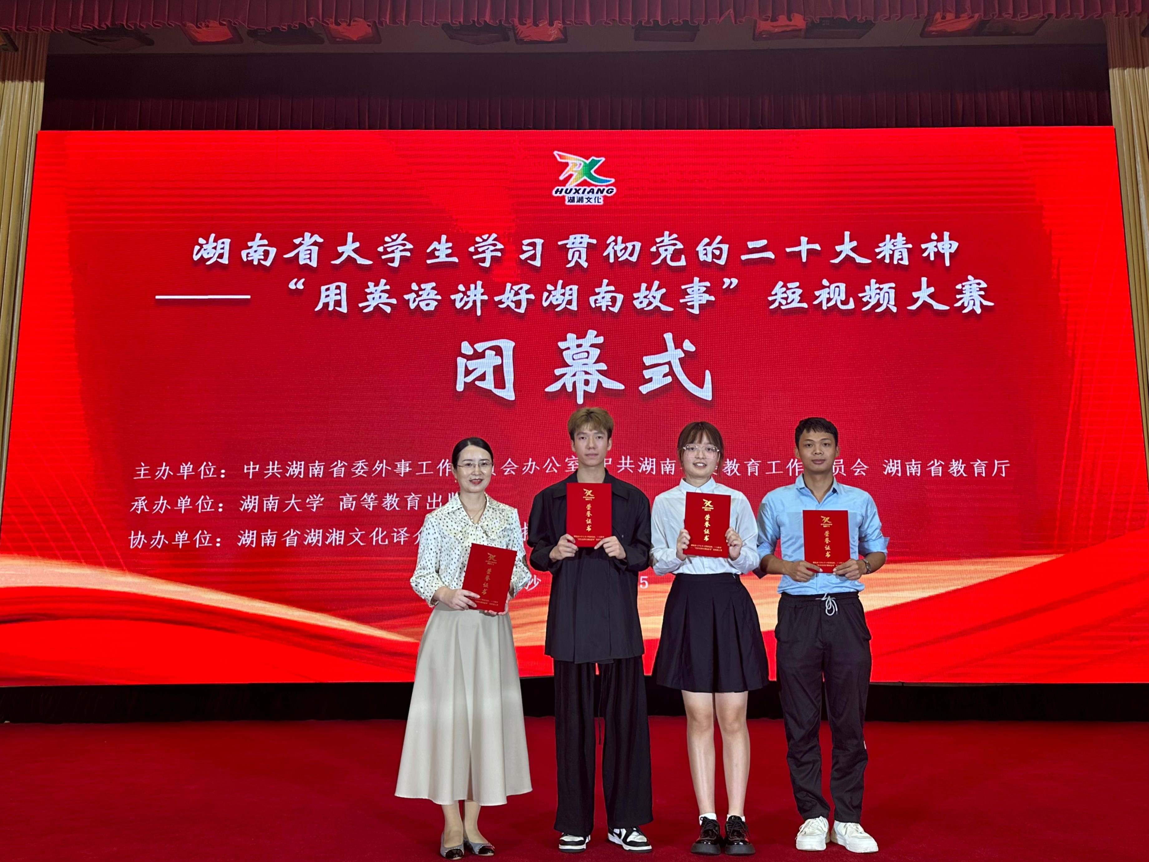 (通讯员 陈凯鹏 宋外飞)9月15日上午,由中共湖南省委外事工作委员会办公室、中共湖南省委教育工作委员会、湖南省教育厅主办,湖南大学、高等教育出版社承办的湖南省老员工学习贯彻党的二十大精神——“用英语讲好湖南故事”短视频大赛闭幕式暨颁奖典礼于长沙市举行。中共湖南省委外办副主任邱爱华、高等教育出版社总编辑谭方正致辞,湖南省教育厅一级巡视员罗桂香宣布获奖名单。本次大赛分本科组和高职高专组,全省高校踊跃参赛,最终全省116所高校共提交297件参赛作品,其中普通本科173件,高职高专124件。经过评审专家组的认真评审,本科组一等奖14件、二等奖21件、三等奖35件;高职高专组一等奖10件、二等奖15件、三等奖25件,12所高校荣获优秀组织奖。伟德BV1946官网选送的四件参赛作品全部获奖。伟德BV1946官网石琳副经理率一二等奖团队代表参加了此次颁奖典礼。