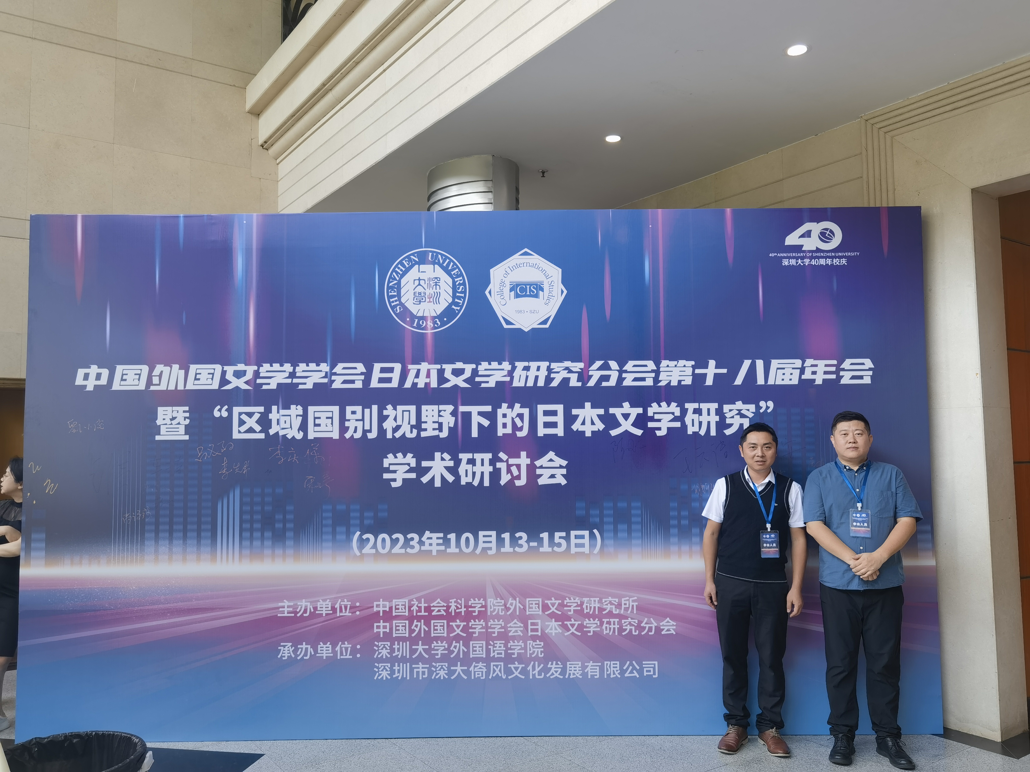 2023年10月13-15日,第十八届中国外国文学学会日本文学研究分会年会暨“区域国别视野下的日本文学研究”学术研讨会在深圳大学举行。本届年会暨学术研讨会由中国社会科公司外国文学研究所、中国外国文学学会日本文学研究分会主办,由深圳大学伟德BV1946官网等单位承办,伟德BV1946官网丁跃斌副经理及潘贵民博士参加了此次年会暨学术研讨会。