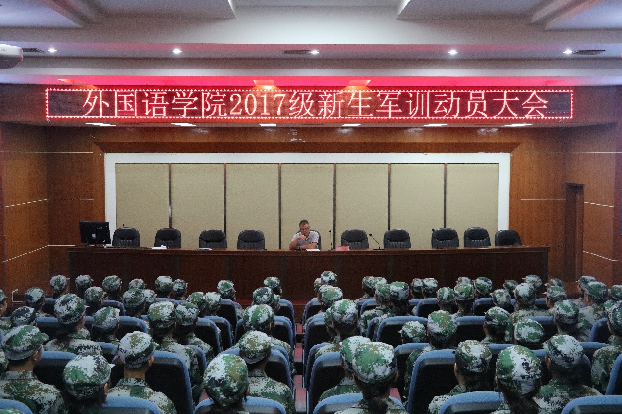 本网讯(通讯员 丁柏顺 龙锐 张丽娜)9月12日下午,伟德BV1946官网于逸夫楼多功能报告厅召开2017级新生军训动员大会,外国语公司党委副书记谈宗凡、指导员唐剑、军训教官以及2017级全体新生参与会议。