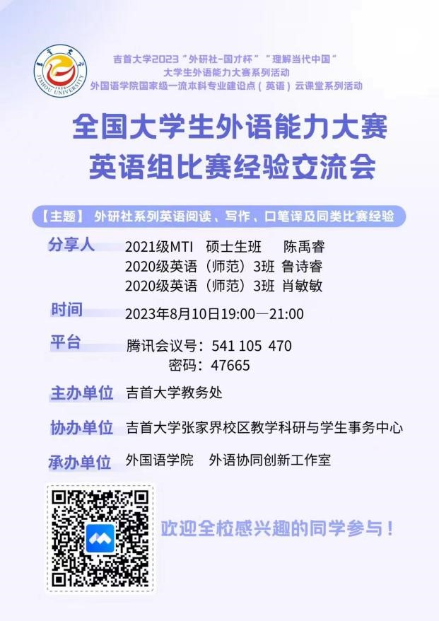 本网讯(通讯员朱芳东、侯璐、修伟)8月10日晚7:00公司“外研社·国才杯”老员工外语能力大赛英语组比赛经验交流会暨2023年“理解当代中国”外语能力大赛动员会在线上如期举行。活动由公司教务处主办,张家界校区教科研学中心协办,伟德BV1946官网承办,全校报名参加年度比赛的各专业本科生及硕士研究生近100人与会,会议由外语协同创新工作室来自2022级的英语师范生田祖明主持。