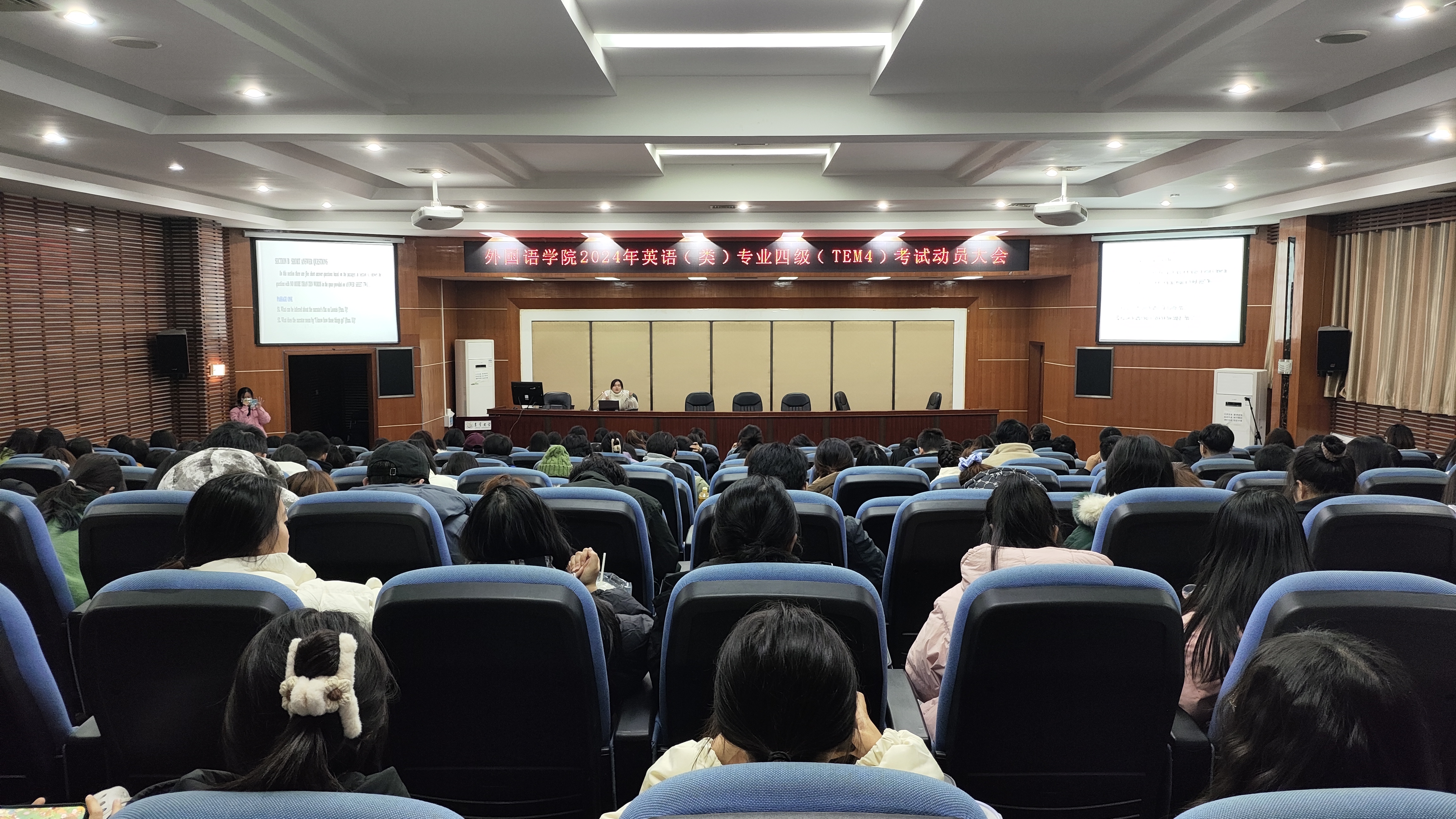 本网讯(通讯员 游馨 姜晓鸥 段沁熊 杨人豪)为强化员工专业意识,找准学习方向,备战2024年的英语专业四级考试,12119:00,受公司委托,英语系组织2022级英语(含师范)、翻译专业员工在张家界校区多功能报告厅举行2024年英语()专业四级(TEM4)考试动员会。英语系主任刘燕、英语语言与教育教研室副主任李娟,以及2021级、2022级张家界校区英语类专业生近200人出席。
