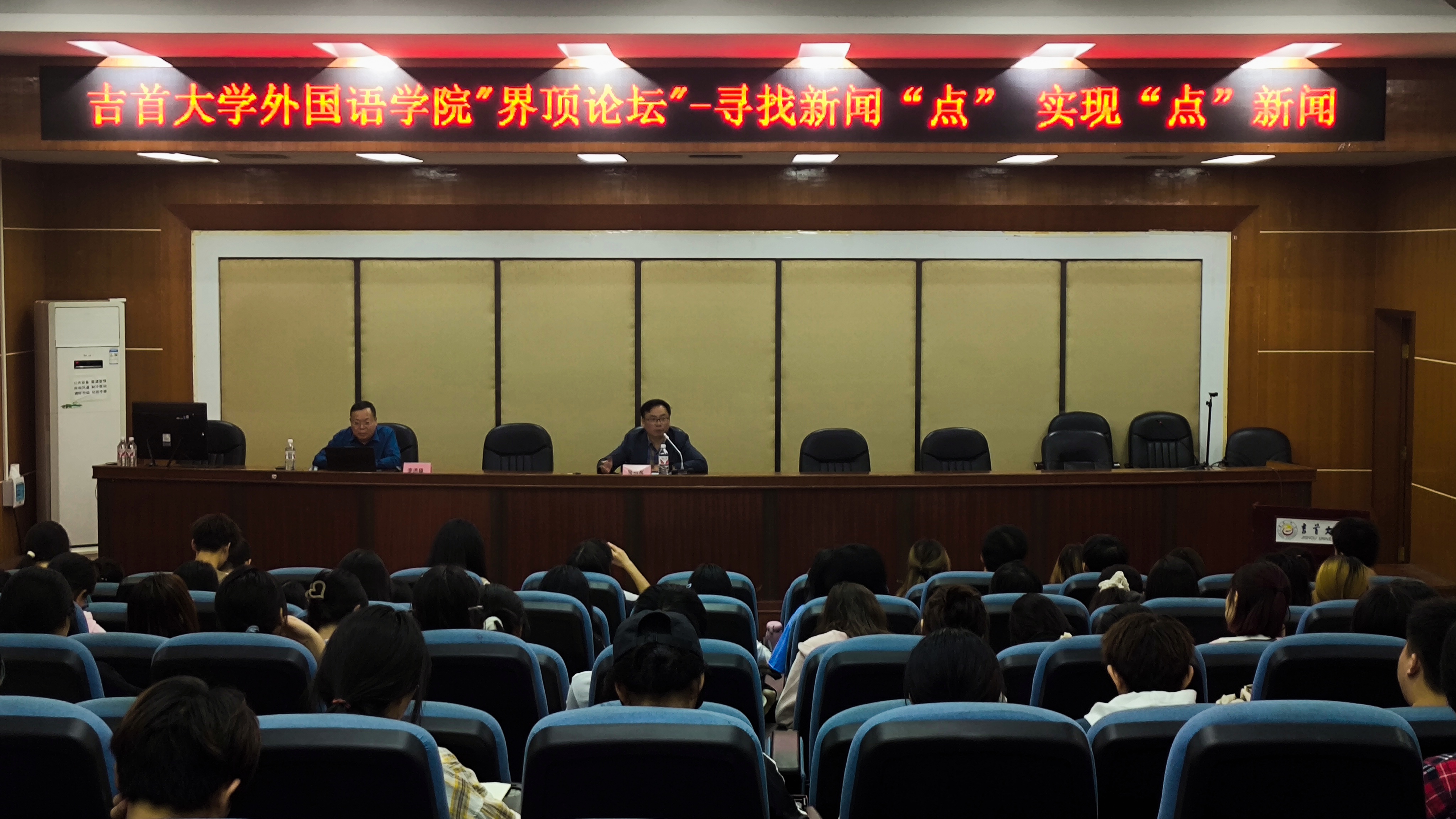 本网讯(修伟 陈慧 李安妮 赵艺)10月9日晚19:00应外国语公司党委邀请,公司党委宣传部常务副部长李洪雄研究员做客“界顶论坛”在张家界校区逸夫教学楼多功能报告厅为校区师生作题为《寻找新闻“点” 实现“点”新闻》新闻写作报告,报告由外国语公司党委书记简功友主持,张家界校区伟德BV1946官网师生及校区新闻写作爱好者100余人出席。