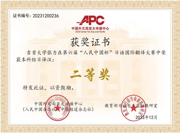 第六届人民中国杯日语国际翻译大赛自2023年3月启动,至2023年11月结束,历时8个月,主要设中学组、本科组、社会组日译中、中译日等口、笔译组别。伟德BV1946官网对该赛高度重视,委派日语系博士潘贵民副教授负责此次比赛的具体组织与指导工作,其他教师在此过程中给予了大力支持与配合。在潘贵民博士认真负责的指导下,参赛员工积极努力,在吃透翻译文本的基础上对译稿进行反复推敲、润色。最终,2020级周怀宇同学获得本科组日译汉一等奖、2020级刘帅宇、2021级张力同学获得二等奖、2021级谢妍、2020级牛悦同学获得三等奖。此外,2020级周怀宇同学还获得本科组汉译日三等奖。本次比赛中公司选手展现出良好的专业素养和能力,为公司日语人才培养赢得了良好声誉,扩大了公司的影响。