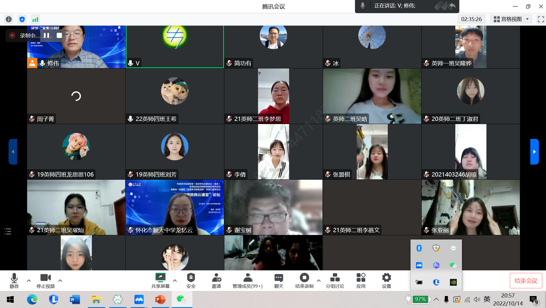 本网讯(修伟)10月14日晚,伟德BV1946官网名师流动站“双师协同云课堂”论坛在线上如期举行,邀请省级教学竞赛获奖者、来自怀化市鹤城区顺天中学石冰、龙忆云两位一线教师,以及公司中小学外语名师流动站首批驻站专家、来自张家界市教育科学研究院专职教研员伍杰作主题分享,拉开了该院为期一个月的国家级一流本科专业建设点(英语专业)名师流动站双师协同课堂系列活动暨湖南省一流课程(“英语教学技能训练”) 双师云课堂活动的序幕。该院经理刘汝荣、副经理简功友、外语教师教育课程团队教师及2019级、2020级全体师范生近300人与会。论坛由该院教师修伟主持。