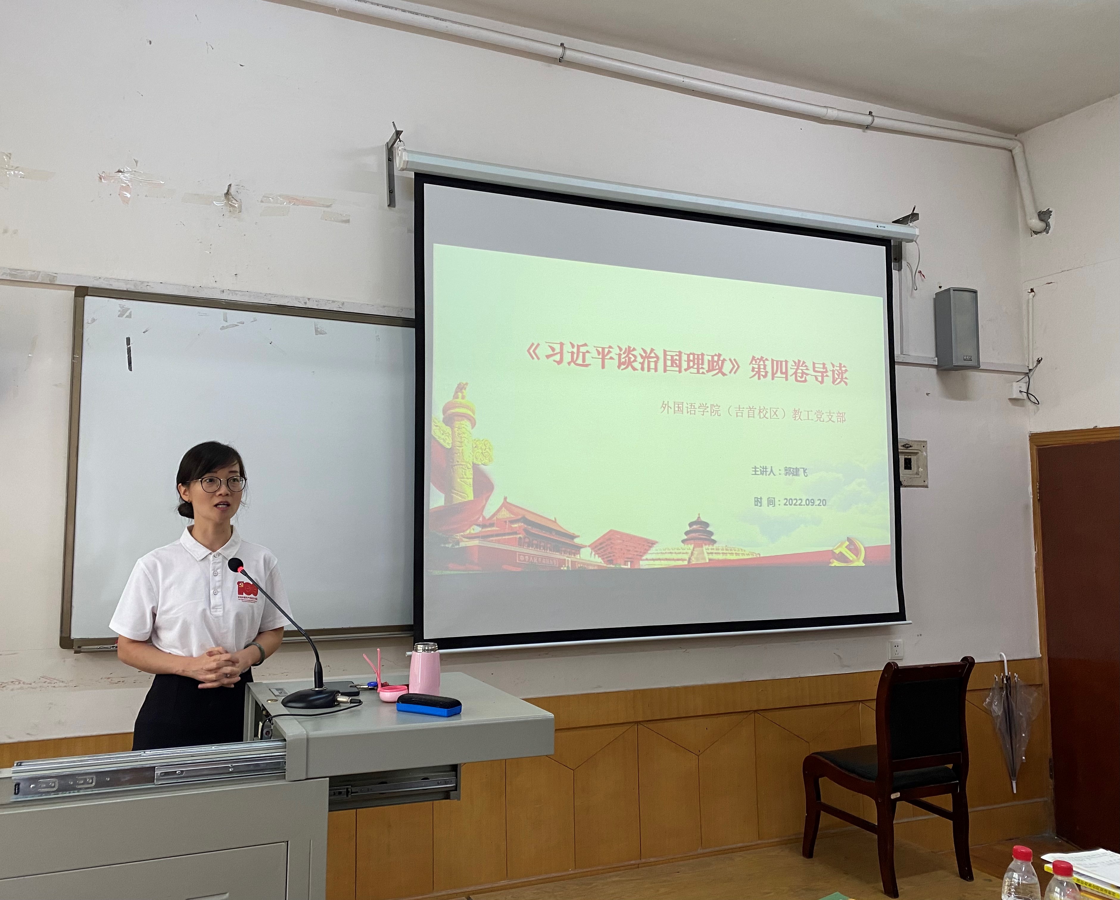 9月20日下午,为深入学习领会习近平新时代中国特色社会主义思想,用党的最新创新理论成果武装全党、教育人民,伟德BV1946官网(吉首校区)教工党支部于1313会议室召开专题学习会,深入学习《习近平谈治国理政》第四卷。会上,支部书记郭建飞主要从《习近平谈治国理政》第四卷出版的时代背景、主要内容、出版的重要意义和学好用好《习近平谈治国理政》第四卷等五个方面出发,带领全体教工党员展开深入学习。